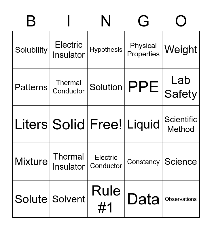 This bingo card has a free space and 34 words: Mass, Data, Pounds, Physical State, Mixture, Thermal Conductor, Weight, Solute, Electric Insulator, Gas, Solution, Hypothesis, Change, Volume, Liquid, Lab Safety, Solvent, Liters, Thermal Insulator, Constancy, Electric Conductor, Systems, Solubility, Scientific Method, Rule #1, Observations, Physical Properties, Grams, PPE, Patterns, Density, Solid, Science and Magnetism.