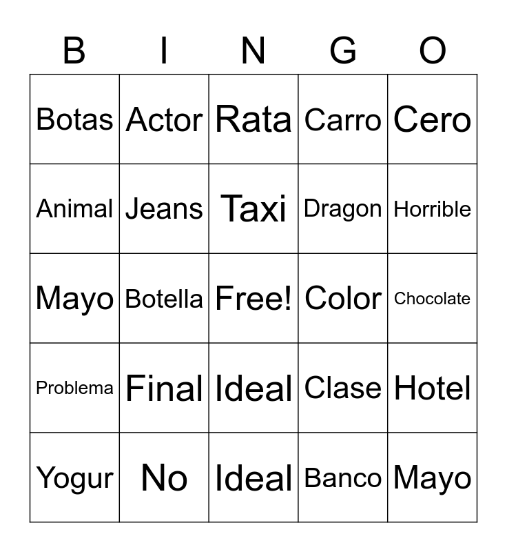 This bingo card has a free space and 24 words: Final, No, Taxi, Yogur, Cero, Botas, Animal, Actor, Color, Ideal, Dragon, Mayo, Clase, Hotel, Jeans, Banco, Chocolate, Rata, Horrible, Botella, Mayo, Problema, Carro and Ideal.