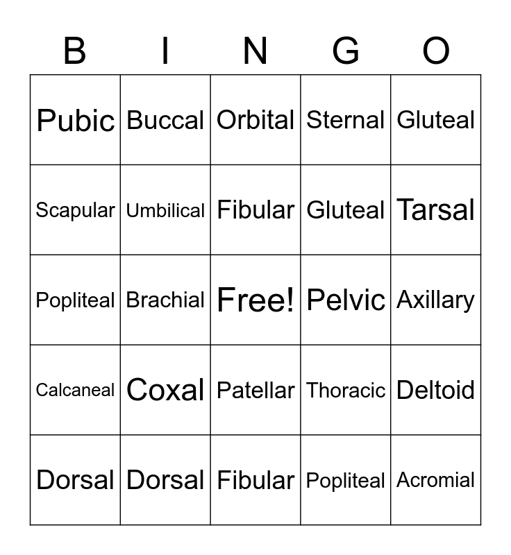 This bingo card has a free space and 83 words: Cephalic, Frontal, Orbital, Nasal, Buccal, Oral, Mental, Cervical, Thoracic, Sternal, Axillary, Abdominal, Umbilical, Pelvic, Inguinal, Pubic, Dorsal, Scapular, Vertebral, Lumbar, Sacral, Gluteal, Acromial, Deltoid, Brachial, Antecubital, Olecranal, Antebrachial, Carpal, Digital, Coxal, Femoral, Patellar, Popliteal, Crural, Sural, Fibular, Pedal, Tarsal, Calcaneal, Digital, Plantar, Cephalic, Frontal, Orbital, Nasal, Buccal, Oral, Mental, Cervical, Thoracic, Sternal, Axillary, Abdominal, Umbilical, Pelvic, Inguinal, Pubic, Dorsal, Scapular, Vertebral, Lumbar, Sacral, Gluteal, Acromial, Deltoid, Brachial, Antecubital, Olecranal, Carpal, Digital, Coxal, Femoral, Patellar, Popliteal, Crural, Sural, Fibular, Pedal, Tarsal, Calcaneal, Digital and Plantar.