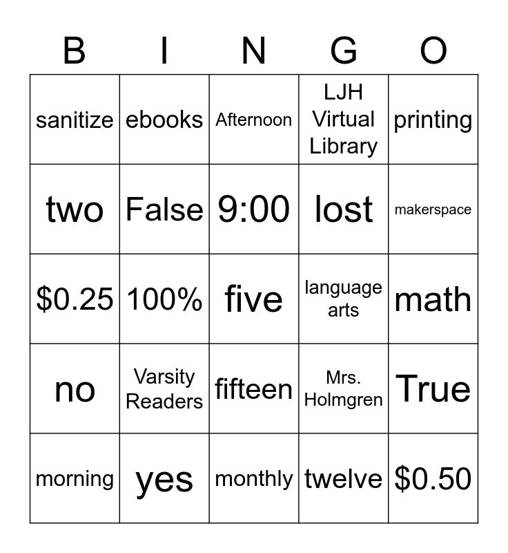 This bingo card has 25 words: Varsity Readers, monthly, 9:00, morning, printing, sanitize, two, ebooks, language arts, fifteen, lost, $0.25, Mrs. Holmgren, True, False, $0.50, math, Afternoon, makerspace, 100%, five, yes, no, LJH Virtual Library and twelve.