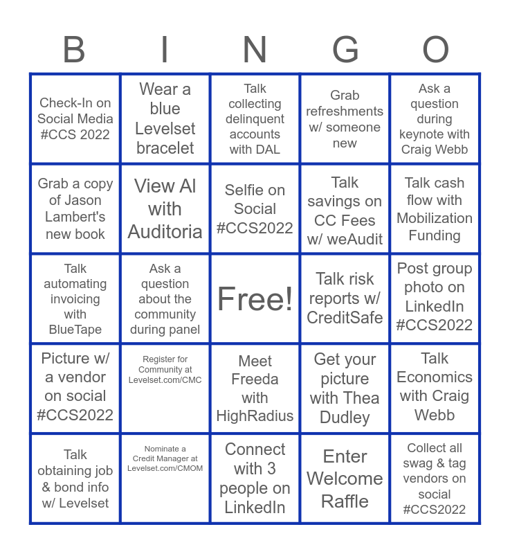 This bingo card has a free space and 24 words: Register for Community at Levelset.com/CMC, Nominate a Credit Manager at Levelset.com/CMOM, Selfie on Social #CCS2022, Talk obtaining job & bond info w/ Levelset, Ask a question during keynote with Craig Webb, Check-In on Social Media #CCS 2022, Grab a copy of Jason Lambert's new book, Wear a blue Levelset bracelet, Talk risk reports w/ CreditSafe, Meet Freeda with HighRadius, Talk savings on CC Fees w/ weAudit, Talk automating invoicing with BlueTape, Get your picture with Thea Dudley, Talk Economics with Craig Webb, View Al with Auditoria, Enter Welcome Raffle, Post group photo on LinkedIn #CCS2022, Talk collecting delinquent accounts with DAL, Talk cash flow with Mobilization Funding, Ask a question about the community during panel, Collect all swag & tag vendors on social #CCS2022, Picture w/ a vendor on social #CCS2022, Grab refreshments w/ someone new and Connect with 3 people on LinkedIn.