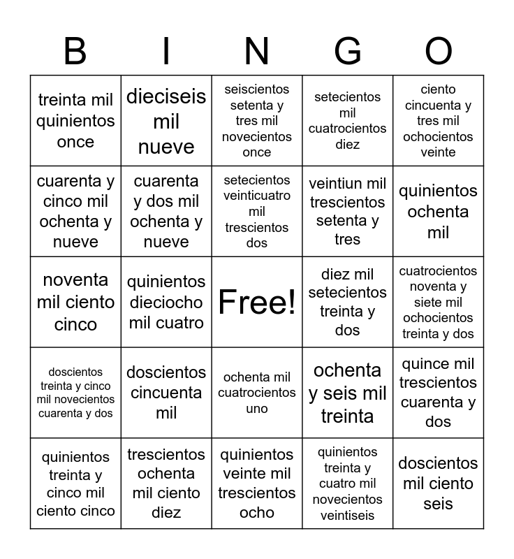 This bingo card has a free space and 24 words: doscientos cincuenta mil, trescientos ochenta mil ciento diez, setecientos veinticuatro mil trescientos dos, quinientos treinta y cinco mil ciento cinco, ciento cincuenta y tres mil ochocientos veinte, treinta mil quinientos once, cuarenta y cinco mil ochenta y nueve, dieciseis mil nueve, diez mil setecientos treinta y dos, ochenta mil cuatrocientos uno, veintiun mil trescientos setenta y tres, noventa mil ciento cinco, ochenta y seis mil treinta, quince mil trescientos cuarenta y dos, cuarenta y dos mil ochenta y nueve, quinientos treinta y cuatro mil novecientos veintiseis, cuatrocientos noventa y siete mil ochocientos treinta y dos, seiscientos setenta y tres mil novecientos once, quinientos ochenta mil, quinientos dieciocho mil cuatro, doscientos mil ciento seis, doscientos treinta y cinco mil novecientos cuarenta y dos, setecientos mil cuatrocientos diez and quinientos veinte mil trescientos ocho.