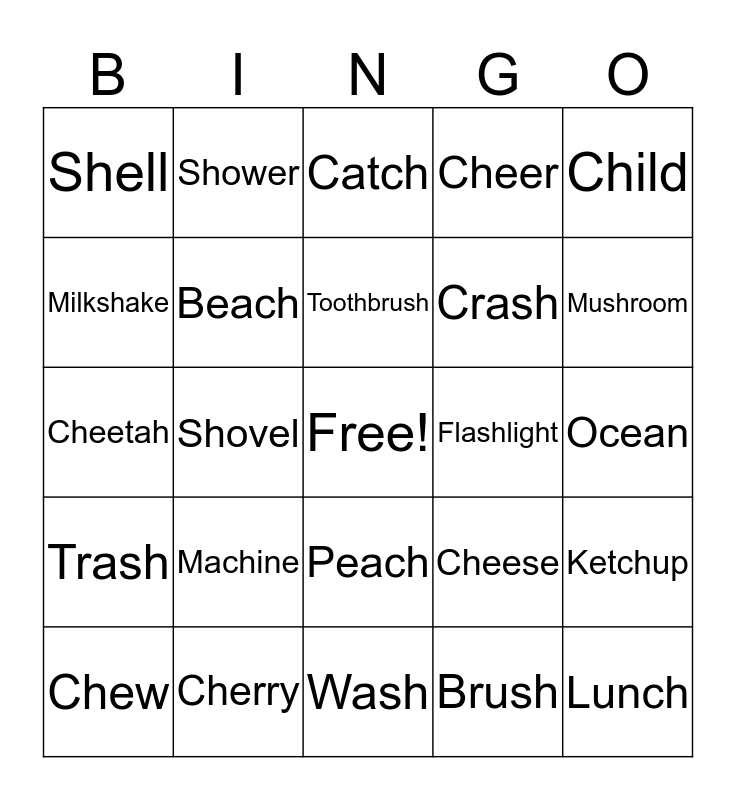 This bingo card has a free space and 31 words: Wash, Couch, Shovel, Kitchen, Shell, Catch, Beach, Cheese, Flashlight, Brush, Ocean, Lunch, Chicken, Shadow, Mushroom, Shampoo, Ketchup, Machine, Trash, Peach, Child, Bush, Chew, Shower, Crash, Milkshake, Cheer, Cheetah, Cherry, Toothbrush and Stretch.