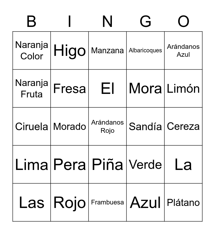 This bingo card has 30 words: Rojo, Uva, Morado, Amarillo, Naranja Color, Manzana, Fresa, Piña, Sandía, Frambuesa, Cereza, Arándanos Rojo, Azul, Plátano, Limón, Mango, Verde, Lima, Pera, Arándanos Azul, Ciruela, Kiwi, Higo, Mora, Naranja Fruta, Albaricoques, La, Las, El and Los.