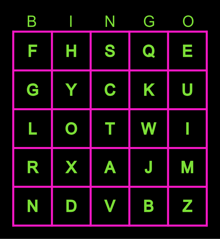 This bingo card has 26 words: A, B, C, D, E, F, G, H, I, J, K, L, M, N, O, P, Q, R, S, T, U, V, W, X, Y and Z.