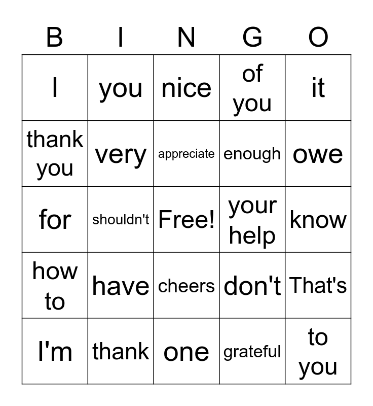 This bingo card has a free space and 24 words: have, thank, appreciate, I'm, it, I, thank you, you, your help, cheers, enough, for, don't, That's, very, grateful, know, nice, owe, shouldn't, to you, how to, of you and one.
