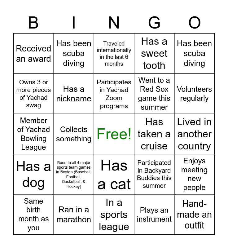 This bingo card has a free space and 29 words: Same birth month as you, Never flown on an airplane, Collects something, Goes to SHAS, Received an award, Traveled internationally in the last 6 months, Has a nickname, Been to all 4 major sports team games in Boston (Baseball, Football, Basketball, & Hockey), Has taken a cruise, Ran in a marathon, Lived in another country, Hand-made an outfit, In a sports league, Plays an instrument, Volunteers regularly, Reads 10+ books this year, Has a cat, Has a dog, Has been scuba diving, Member of Yachad Bowling League, Participated in Backyard Buddies this summer, Went to the zoo with Yachad, Went to a Red Sox game this summer, Owns 3 or more pieces of Yachad swag, Has a sweet tooth, Has been scuba diving, Enjoys meeting new people, Participates in Yachad Zoom programs and Has a hidden talent- show it off!.