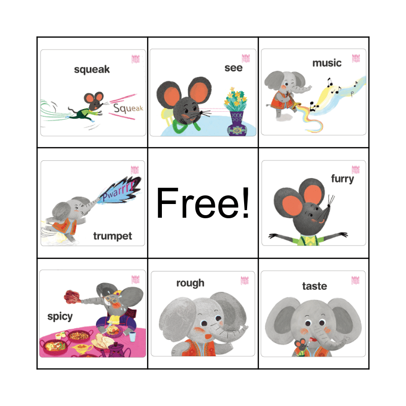 This bingo card has 8 images and a free space.