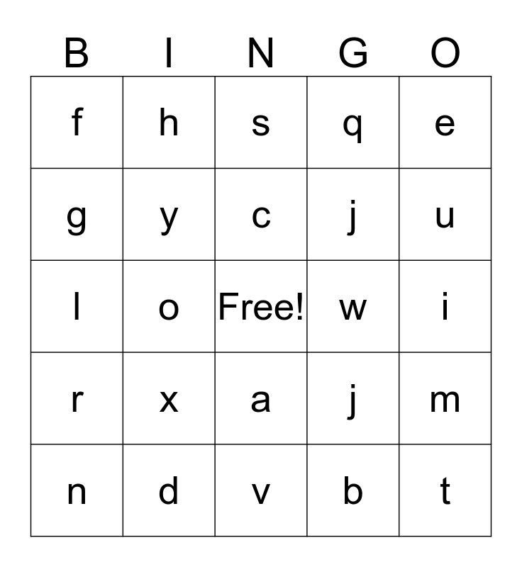 This bingo card has a free space and 26 words: a, b, c, d, e, f, g, h, i, j, j, l, m, n, o, p, q, r, s, t, u, v, w, x, y and z.