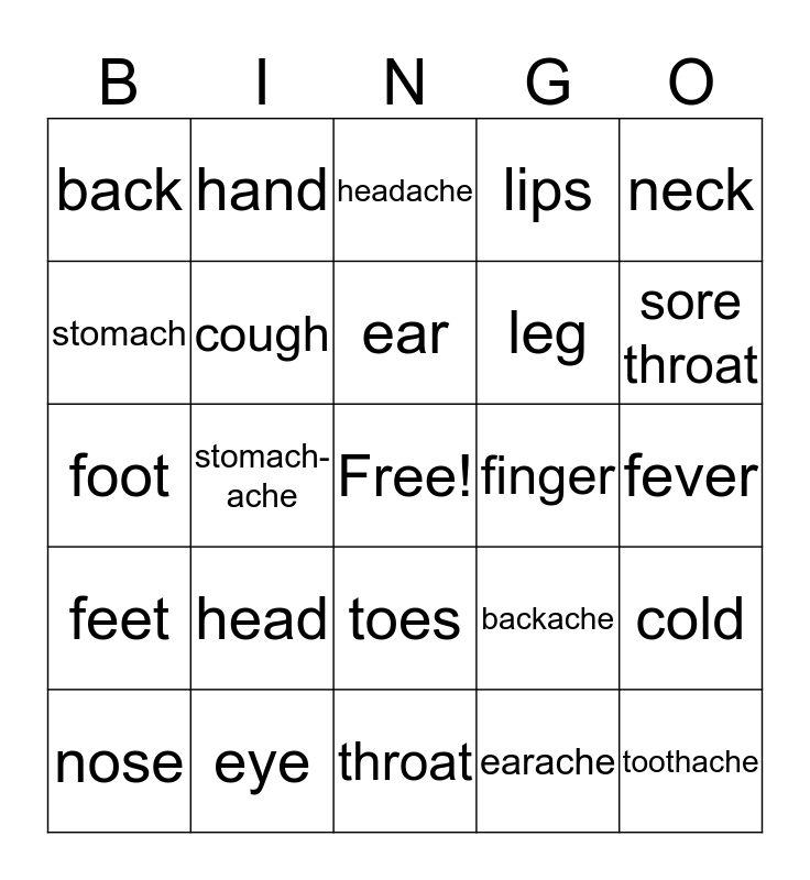 This bingo card has a free space and 24 words: head, eye, ear, nose, neck, back, stomach, hand, finger, toes, leg, foot, backache, cold, cough, earache, fever, headache, sore throat, stomach-ache, toothache, feet, lips and throat.