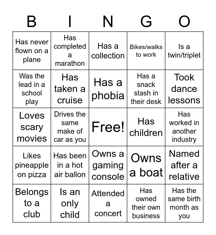 This bingo card has a free space and 59 words: Has worked for BNS for 10+ Years, Is an only child, Participates in a competitive sport, Likes pineapple on pizza, Has owned their own business, Has worked for a family business, Has taken a cruise, Loves watching documentaries, Has a snack stash in their desk, Has worked for the competition, Bikes/walks to work, Works out before work, Was the lead in a school play, Has been skydiving, Has won an award, Has never flown on a plane, Has the same birth month as you, Is a twin/triplet, Has a cat, Has a phobia, Has children, Has a collection, Belongs to a club, Named after a relative, Has worked for BNS for less than a year, Never learned to ride a bike, Loves to cook, Speaks 2+ languages, Took dance lessons, Has met a celebrity, Owns cryptocurrency, Moved in the past year, Volunteers, Has a dog, Has completed a marathon, Is left- handed, Got engaged, married or had a baby during COVID, Drives the same make of car as you, Has been married for 25+ years, Loves scary movies, Has a nickname, Has been in a hot air ballon, Has worked in another industry, This is their first job, Hikes, Going on vacation soon, Drinks 2+ cups of coffee a day, Has pranked a co-worker, Owns a gaming console, Attended a concert, Has been to the olympics, Does yoga, Has been on a blind date, Took a how-to class recently, Has broken a bone or has a scar, Owns a boat, Can bake a cake from scratch, Loves to read and Creates art.