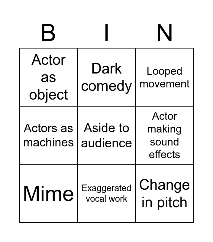 This bingo card has 9 words: Mime, Looped movement, Dark comedy, Actors as machines, Actor as object, Actor making sound effects, Aside to audience, Change in pitch and Exaggerated vocal work.