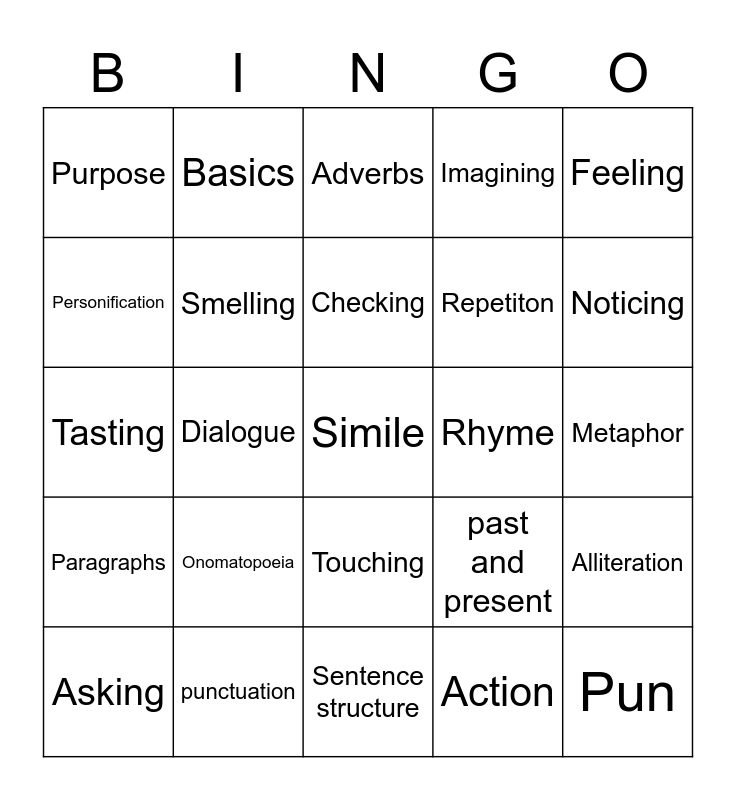 This bingo card has 25 words: Paragraphs, punctuation, Simile, Action, Feeling, Purpose, Basics, Adverbs, Rhyme, Alliteration, Personification, Smelling, Sentence structure, past and present, Noticing, Asking, Dialogue, Checking, Repetiton, Metaphor, Tasting, Onomatopoeia, Touching, Imagining and Pun.