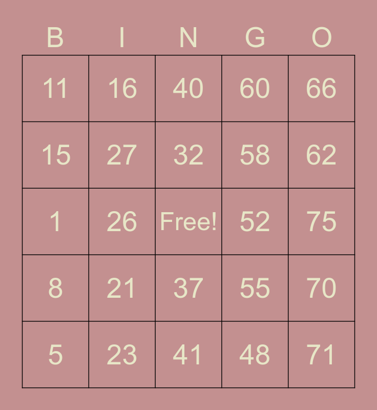 This bingo card has a free space and 24 words: 5, 21, 32, 48, 66, 11, 16, 40, 52, 75, 1, 27, 55, 70, 15, 23, 41, 60, 62, 8, 26, 37, 58 and 71.