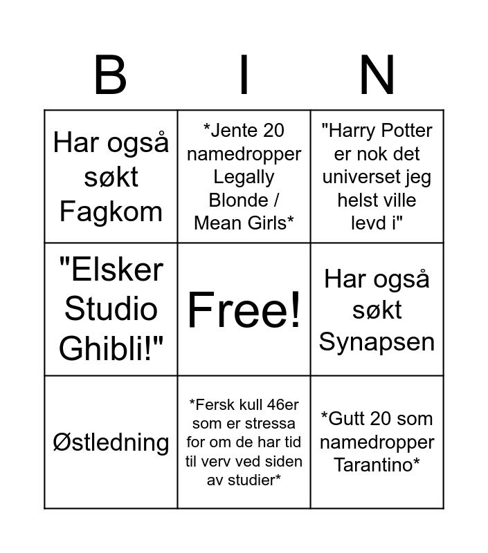 This bingo card has a free space and 8 words: Har også søkt Synapsen, "Harry Potter er nok det universet jeg helst ville levd i", *Jente 20 namedropper Legally Blonde / Mean Girls*, Østledning, Har også søkt Fagkom, *Gutt 20 som namedropper Tarantino*, "Elsker Studio Ghibli!" and *Fersk kull 46er som er stressa for om de har tid til verv ved siden av studier*.