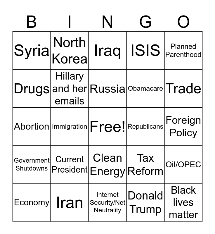 This bingo card has a free space and 24 words: Current President, Iran, Russia, Economy, Planned Parenthood, Syria, Drugs, North Korea, Republicans, Clean Energy, Obamacare, Abortion, Tax Reform, Oil/OPEC, Hillary and her emails, Donald Trump, Foreign Policy, Iraq, Trade, Immigration, Black lives matter, Government Shutdowns, ISIS and Internet Security/Net Neutrality.