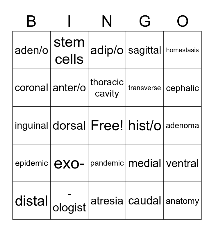 This bingo card has a free space and 29 words: distal, proximal, dorsal, autopsy, aden/o, adip/o, anter/o, exo-, hist/o, -ologist, adenoma, anatomy, atresia, caudal, cephalic, endemic, pandemic, epidemic, homestasis, inguinal, medial, lateral, transverse, coronal, sagittal, stem cells, ventral, thoracic cavity and posterior.