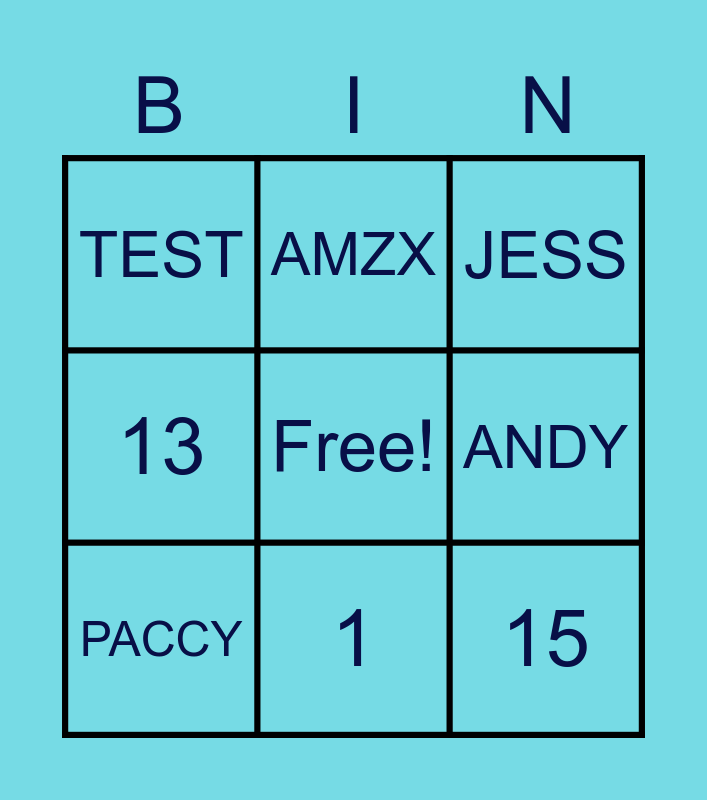 This bingo card has a free space and 8 words: ANDY, JESS, AMZX, PACCY, TEST, 15, 13 and 1.