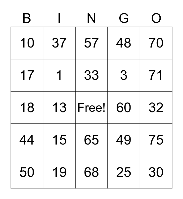 This bingo card has a free space and 24 words: 15, 19, 33, 50, 70, 10, 17, 37, 60, 65, 3, 18, 49, 75, 1, 25, 32, 57, 71, 13, 30, 44, 48 and 68.