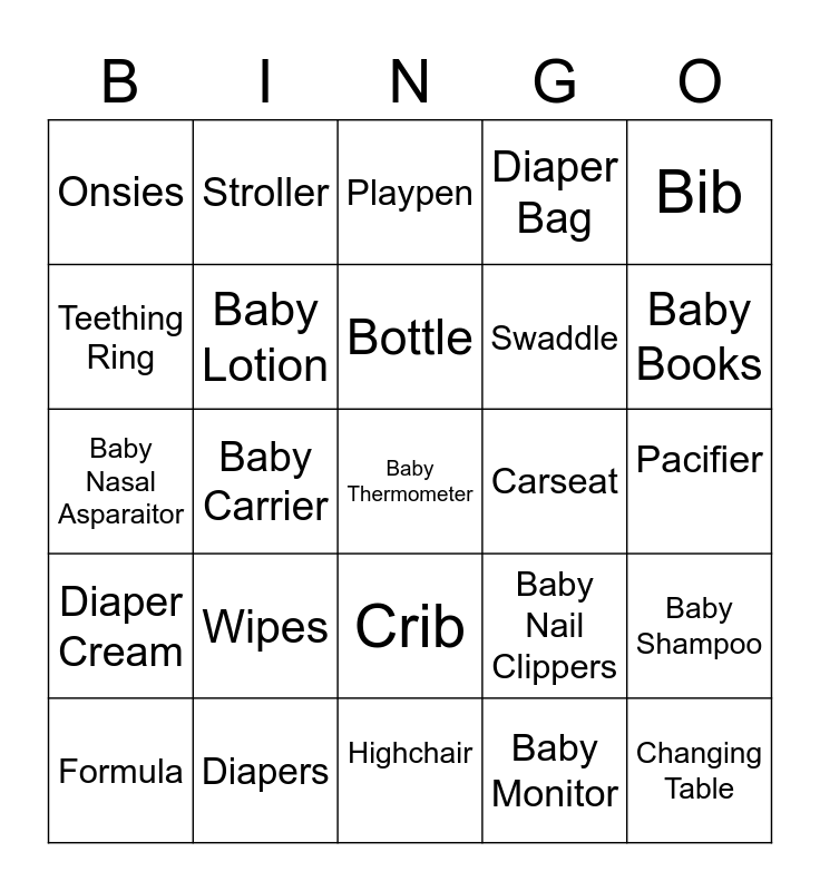 This bingo card has a free space and 24 words: Wipes, Diapers, Bottle, Formula, Bib, Onsies, Teething Ring, Stroller, Carseat, Crib, Swaddle, Baby Nasal Asparaitor, Baby Nail Clippers, Baby Shampoo, Baby Lotion, Baby Monitor, Pacifier, Playpen, Baby Books, Baby Carrier, Changing Table, Diaper Cream, Diaper Bag and Highchair.