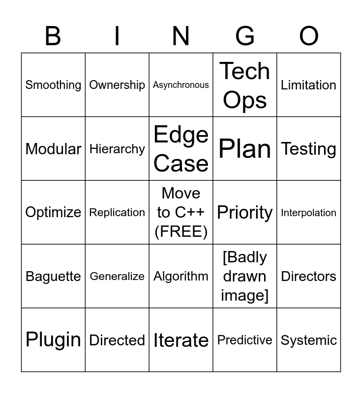 This bingo card has a free space and 24 words: Generalize, Directed, Edge Case, Plugin, Limitation, Smoothing, Modular, Ownership, Priority, Algorithm, Plan, Optimize, [Badly drawn image], Directors, Hierarchy, Predictive, Interpolation, Asynchronous, Testing, Replication, Systemic, Baguette, Tech Ops and Iterate.