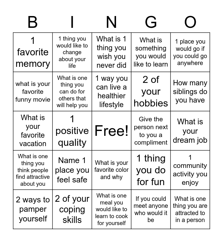 This bingo card has a free space and 24 words: Name 1 place you feel safe, 2 of your coping skills, 1 way you can live a healthier lifestyle, 2 ways to pamper yourself, 1 place you would go if you could go anywhere, 1 favorite memory, what is your favorite funny movie, 1 thing you would like to change about your life, Give the person next to you a compliment, What is your favorite color and why, 2 of your hobbies, What is your favorite vacation, 1 thing you do for fun, 1 community activity you enjoy, What is one thing you can do for others that will help you, If you could meet anyone who would it be, What is your dream job, What is 1 thing you wish you never did, How many siblings do you have, 1 positive quality, What is one thing you are attracted to in a person, What is one thing you think people find attractive about you, What is something you would like to learn and What is one meal you would like to learn to cook for yourself.
