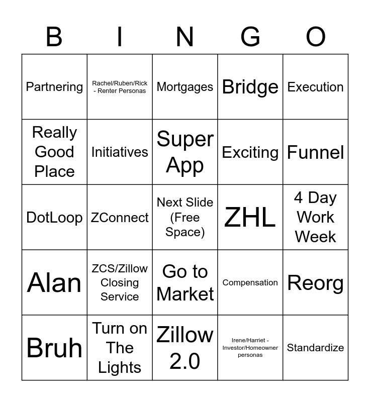 This bingo card has a free space and 61 words: Own It, Turn on The Lights, Beth/Sebastian/Shelby - Buyer/Seller personas, Alan, Irene/Harriet - Investor/Homeowner personas, Tour, Initiatives, Empowering, Exciting, Offers, Bridge, Unlocking Life's Next Chapter, Really Good Place, Cross Functional, Best In-class, Partnering, Standardize, Execution, InstantBook, Super App, ZHL, Mortgages, Bruh, Reorg, Customer Solutions, Find the One, Test Kitchen, Strategy, Funnel, Insights, Voice of the Customer, Integrated Buying Experience, Danger Zone, Innovation, Rachel/Ruben/Rick - Renter Personas, LOB/Line of Business, Subgraph/GraphQL, ZConnect, PA/Premier Agent, DotLoop, zDocs, ZCS/Zillow Closing Service, 4 Day Work Week, Inflation, Compensation, Equity, zRes/Zillow Real Estate Software, One Zillow, RMX, Go to Market, Zillow 2.0, Rowing/Row the boat/In the boat, AI/ML, StreetEasy, ShowingTime/ShowingTime 2.0/ShowingTime+, OpenDoor, Build Together Summit, Connections, Spotlight, Showcase and Chasm of Despair.
