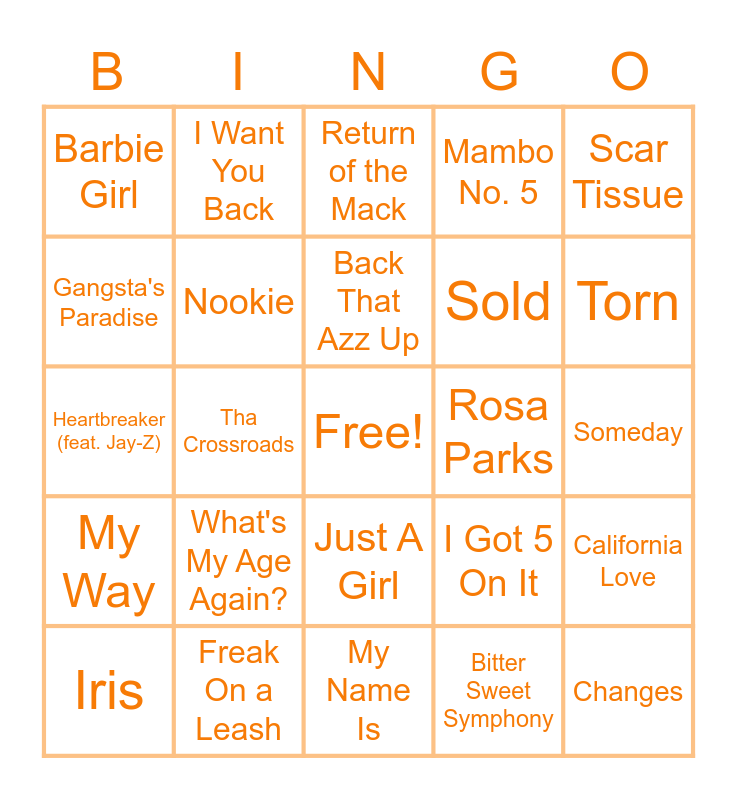 This bingo card has a free space and 78 words: Give Me One Reason, Semi-Charmed Life, Return of the Mack, 1979, ...Baby One More Time, I Want It That Way, Say You'll Be There, Don't Let Go (Love), MMMBop, Let Me Clear My Throat, No Diggity, No Scrubs, Mambo No. 5, Barbie Girl, Good Riddance (Time of Your Life), Gangsta's Paradise, If It Makes You Happy, What's My Age Again?, My Own Worst Enemy, Someday, The Bad Touch, Scar Tissue, Heartbreaker (feat. Jay-Z), Back That Azz Up, Nookie, Still D.R.E., Bills, Bills, Bills, This Is How We Do It, Ironic, What I Got, Torn, Hypnotize, My Name Is, Genie In A Bottle, Iris, Rosa Parks, I Don't Want to Miss a Thing, Doo Wop (That Thing), Song 2, Changes, One Week, My Heart Will Go On, The Way, Around the World, Everybody (Backstreet's Back), I Want You Back, Lovefool, One Headlight, Push, Tearin' up My Heart, California Love, Tha Crossroads, I Got 5 On It, Always Be My Baby, Hard Knock Life (Ghetto Anthem), Shimmer, Ghetto Supastar (That Is What You Are), Wanna Be A Baller, Are You That Somebody, Just A Girl, Sold, Boombastic, Man! I Feel Like A Woman!, Scream, The Beautiful People, Intergalactic, Too Close, Can I Get A..., My Way, Freak On a Leash, Bulls On Parade, Pepper, Pretty Fly (For A White Guy), Higher, Bitter Sweet Symphony, Cowboy, Wannabe and Thong Song.