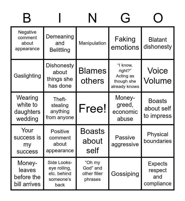 This bingo card has a free space and 24 words: Positive comment about appearance, Side Looks- eye rolling, etc. behind someone’s back, Blames others, Money- leaves before the bill arrives, Blatant dishonesty, Negative comment about appearance, Gaslighting, Demeaning and Belittling, Money- greed, economic abuse, Boasts about self, “I know, right?” Acting as though she already knows, Wearing white to daughters wedding, Passive aggressive, Physical boundaries, Dishonesty about things she has done, Gossiping, Boasts about self to impress, Manipulation, Voice Volume, Theft- stealing anything from anyone, Expects respect and compliance, Your success is my success, Faking emotions and “Oh my God” and other filler phrases.