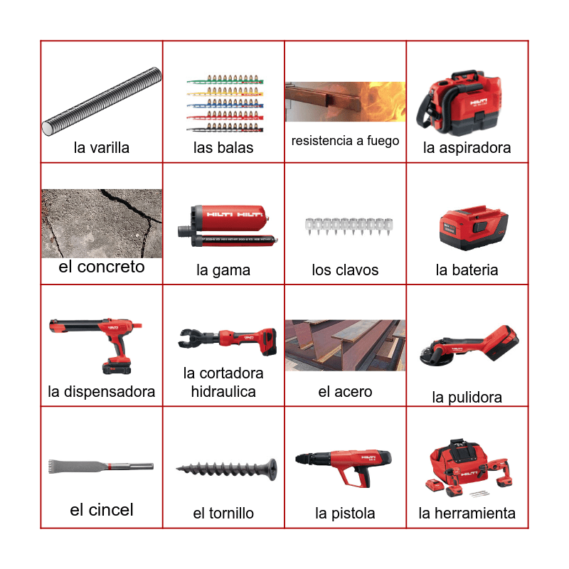 This bingo card has 32 images and 32 words: la ancla, el cargador, la pulidora, lana mineral, la herramienta, los clavos, el concreto, la broca, las balas, las puntas, la bateria, resistencia a fuego, el taladro, el rotomartillo, el tornillo, el cortafuego, la madera, el acero, el bloque, la tablaroca, herramienta inalambrica, el disco, la pistola, el laser, el cincel, la aspiradora, la dispensadora, la gama, la varilla, las pulgadas, la sierra and la cortadora hidraulica.