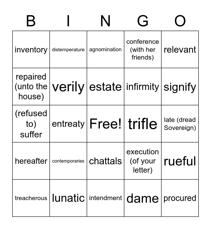 This bingo card has a free space and 24 words: contemporaries, lunatic, estate, treacherous, relevant, inventory, repaired (unto the house), distemperature, trifle, chattals, infirmity, (refused to) suffer, execution (of your letter), rueful, verily, dame, late (dread Sovereign), agnomination, signify, entreaty, procured, hereafter, conference (with her friends) and intendment.