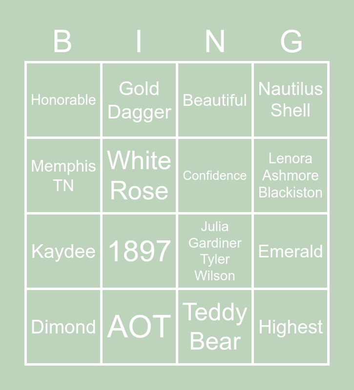 This bingo card has 22 words: AOT, Sarah Turner White, Gold Dagger, Pearl, White Rose, Confidence, Honorable, Beautiful, Julia Gardiner Tyler Wilson, Highest, Kaydee, Nautilus Shell, Sisterhood, Girl Scouts, Teddy Bear, Theta Kappa, Emerald, Dimond, 1897, Memphis TN, Lenora Ashmore Blackiston and Mary Sommerville Sparks Hendricks.