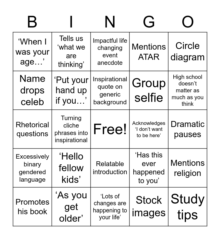 This bingo card has a free space and 24 words: Promotes his book, ‘Hello fellow kids’, Inspirational quote on generic background, Stock images, Circle diagram, ‘When I was your age…’, Tells us ‘what we are thinking’, Impactful life changing event anecdote, Acknowledges ‘I don’t want to be here’, Dramatic pauses, Rhetorical questions, ‘Put your hand up if you…’, ‘Has this ever happened to you’, Mentions religion, Name drops celeb, ‘As you get older’, ‘Lots of changes are happening to your life’, Mentions ATAR, High school doesn’t matter as much as you think, Excessively binary gendered language, Turning cliche phrases into inspirational, Relatable introduction, Group selfie and Study tips.