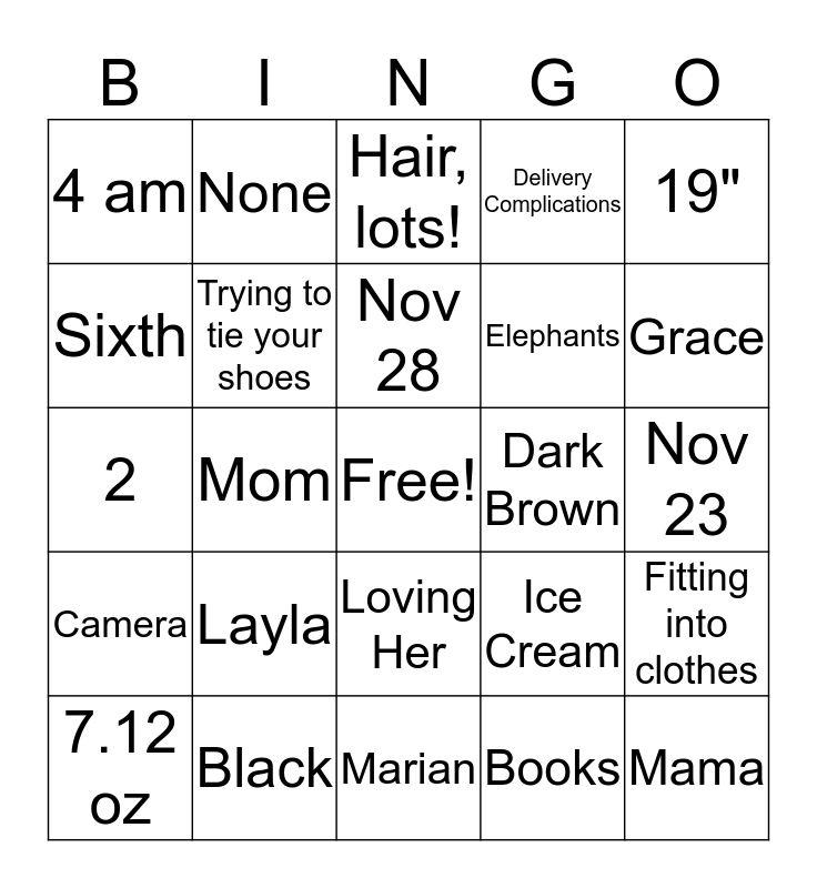 This bingo card has a free space and 24 words: Layla, Black, Nov 28, 7.12 oz, 19", 4 am, Sixth, None, Dark Brown, Loving Her, Elephants, 2, Ice Cream, Fitting into clothes, Trying to tie your shoes, Books, Nov 23, Hair, lots!, Grace, Mom, Mama, Camera, Delivery Complications and Marian.