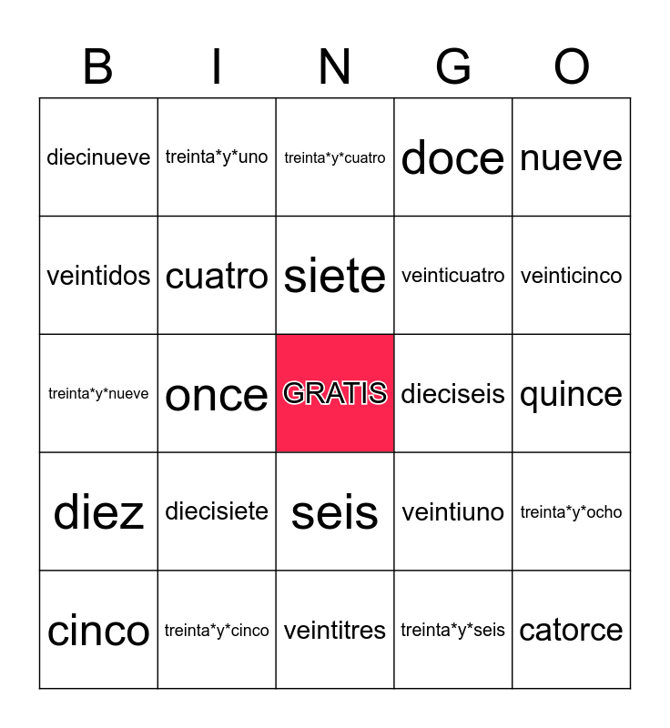 This bingo card has a free space and 39 words: uno, dos, tres, cuatro, cinco, seis, siete, ocho, nueve, diez, once, doce, catorce, quince, dieciseis, diecisiete, dieciocho, diecinueve, veinte, veintiuno, veintidos, veintitres, veinticuatro, veinticinco, veintiseis, veintisiete, veintiocho, veintinueve, treinta, treinta*y*uno, treinta*y*dos, treinta*y*tres, treinta*y*cuatro, treinta*y*cinco, treinta*y*seis, treinta*y*siete, treinta*y*ocho, treinta*y*nueve and cero.