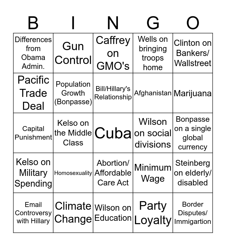 This bingo card has a free space and 24 words: Homosexuality, Climate Change, Bill/Hillary's Relationship, Email Controversy with Hillary, Clinton on Bankers/ Wallstreet, Differences from Obama Admin., Pacific Trade Deal, Gun Control, Wilson on social divisions, Abortion/ Affordable Care Act, Afghanistan, Capital Punishment, Minimum Wage, Steinberg on elderly/ disabled, Population Growth (Bonpasse), Party Loyalty, Bonpasse on a single global currency, Caffrey on GMO's, Marijuana, Kelso on the Middle Class, Border Disputes/ Immigartion, Kelso on Military Spending, Wells on bringing troops home and Wilson on Education.