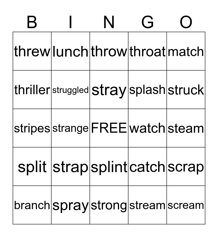 This bingo card has a free space and 31 words: strong, string, strange, three, threw, throw, struggled, catch, watch, stream, steam, scream, spring, sprinkle, struck, strike, scrap, strap, split, splint, match, batch, branch, lunch, splash, thriller, throat, stripes, spray, stray and sprain.