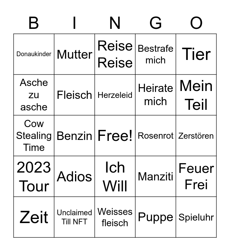 This bingo card has a free space and 33 words: Frau Schneider, Frau Kruspe, Benzin, Live aus Berlin, 2023 Tour, Fleisch, Tier, Zeit, Mutter, Sehnsucht, Herzeleid, Reise Reise, At the lake am See, Klavier, Rosenrot, Mein Teil, Unclaimed Till NFT, Cow Stealing Time, Adios, Manziti, Ich Will, Zick Zack, Donaukinder, Zerstören, Weisses fleisch, Spieluhr, Bestrafe mich, Heirate mich, Asche zu asche, Feuer Frei, Sonne, Puppe and Weit weg.
