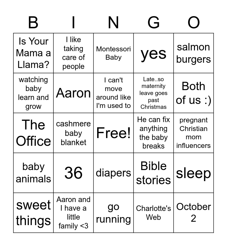 This bingo card has a free space and 24 words: 36, Aaron and I have a little family <3, I can't move around like I'm used to, sweet things, salmon burgers, Is Your Mama a Llama?, watching baby learn and grow, I like taking care of people, He can fix anything the baby breaks, diapers, Late..so maternity leave goes past Christmas, The Office, Bible stories, sleep, Aaron, Charlotte's Web, pregnant Christian mom influencers, Montessori Baby, Both of us :), cashmere baby blanket, October 2, baby animals, yes and go running.