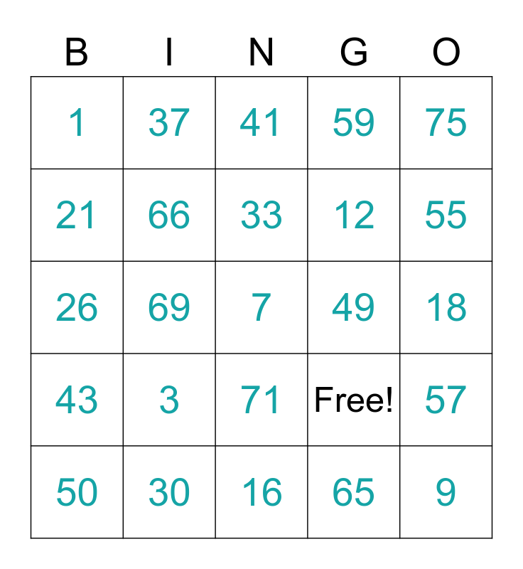 This bingo card has 25 words: 3, 16, 33, 50, 75, 1, 21, 37, 49, 71, 12, 26, Free!, 57, 66, 9, 18, 41, 55, 69, 7, 30, 43, 59 and 65.