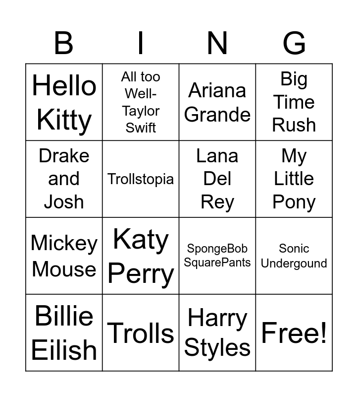 This bingo card has 16 words: Trolls, Sonic Undergound, Ariana Grande, Hello Kitty, Mickey Mouse, All too Well- Taylor Swift, SpongeBob SquarePants, Harry Styles, Drake and Josh, Trollstopia, Billie Eilish, Big Time Rush, Katy Perry, My Little Pony, Lana Del Rey and Free!.