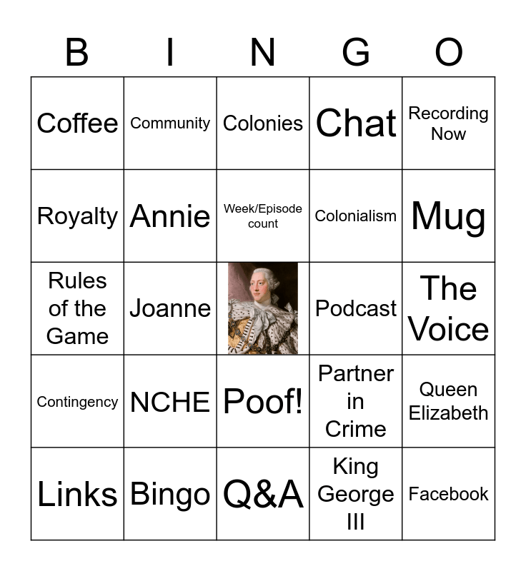 This bingo card has a free space and 28 words: Queen Elizabeth, Monarchy, Colonialism, King George III, Royalty, Colonies, Community, Contingency, Podcast, Links, Rules of the Game, Chat, Bingo, Q&A, Mug, Newbie, NCHE, Annie, Week/Episode count, Poof!, Coffee, Karalee, Facebook, Joanne, The Voice, Partner in Crime, Recording Now and After Party.
