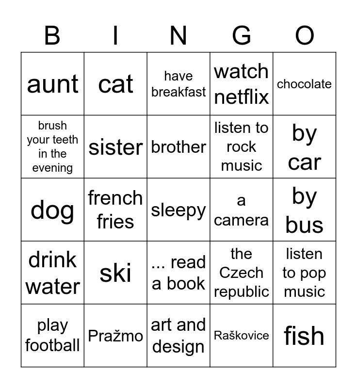 This bingo card has a free space and 24 words: ski, Pražmo, brother, play football, chocolate, aunt, brush your teeth in the evening, cat, a camera, ... read a book, listen to rock music, dog, the Czech republic, listen to pop music, sister, Raškovice, by bus, have breakfast, by car, french fries, fish, drink water, watch netflix and art and design.