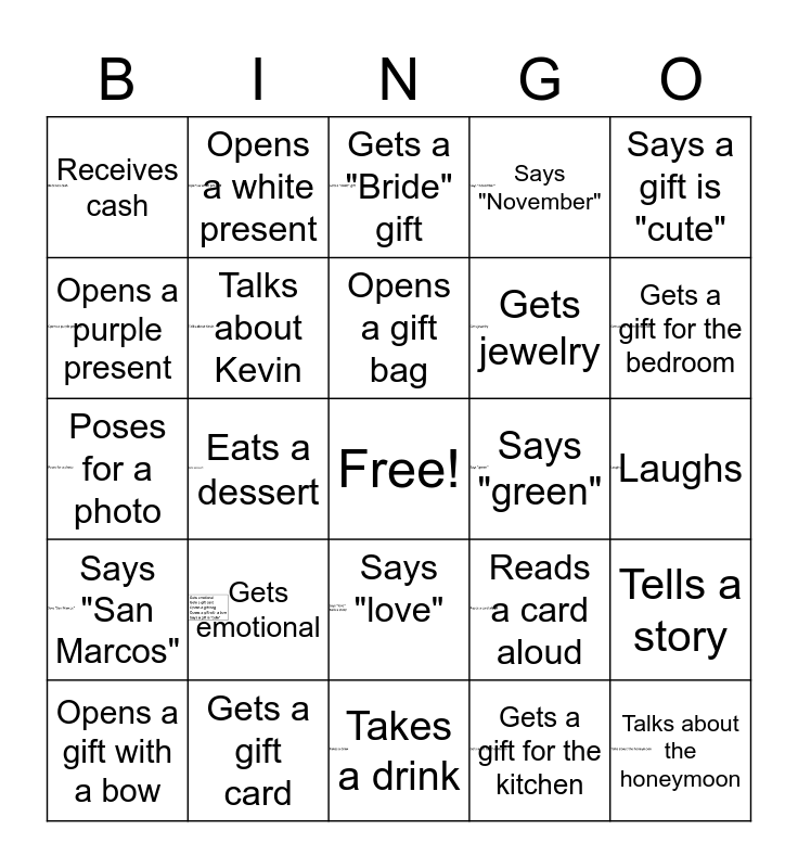 This bingo card has 19 images, a free space and 24 words: Gets emotional, Gets a gift card, Opens a gift bag, Opens a gift with a bow, Says a gift is "cute", Receives cash, Opens a purple present, Opens a white present, Says "green", Says "love", Gets jewelry, Poses for a photo, Reads a card aloud, Tells a story, Talks about Kevin, Gets a gift for the kitchen, Laughs, Gets a "Bride" gift, Gets a gift for the bedroom, Eats a dessert, Talks about the honeymoon, Says "San Marcos", Says "November" and Takes a drink.