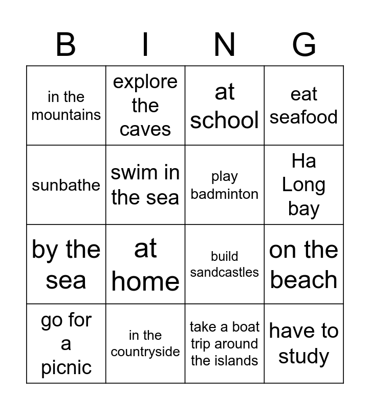 This bingo card has 16 words: in the countryside, on the beach, at school, in the mountains, by the sea, explore the caves, build sandcastles, take a boat trip around the islands, sunbathe, swim in the sea, go for a picnic, eat seafood, at home, Ha Long bay, play badminton and have to study.