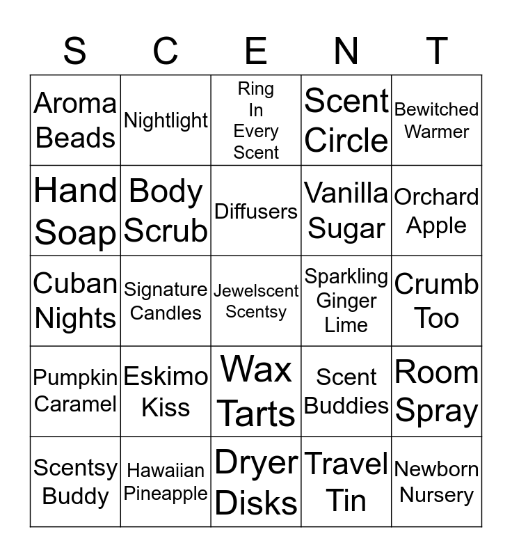 This bingo card has a free space and 24 words: Eskimo Kiss, Hawaiian Pineapple, Diffusers, Scentsy Buddy, Bewitched Warmer, Aroma Beads, Hand Soap, Nightlight, Sparkling Ginger Lime, Wax Tarts, Vanilla Sugar, Cuban Nights, Scent Buddies, Room Spray, Body Scrub, Travel Tin, Crumb Too, Ring In Every Scent, Orchard Apple, Signature Candles, Newborn Nursery, Pumpkin Caramel, Scent Circle and Dryer Disks.
