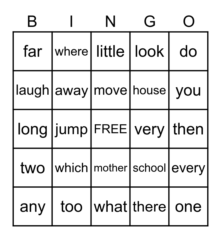 This bingo card has a free space and 24 words: which, too, move, any, do, far, laugh, where, very, mother, house, long, school, every, away, there, then, little, you, jump, one, two, look and what.