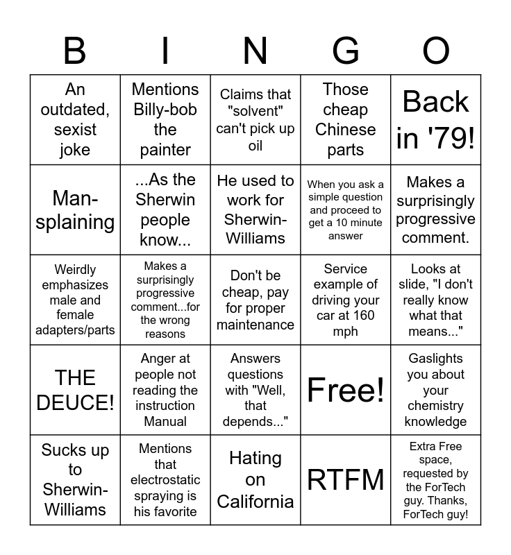 This bingo card has 25 words: Anger at people not reading the instruction Manual, Hating on California, He used to work for Sherwin-Williams, Sucks up to Sherwin-Williams, Back in '79!, An outdated, sexist joke, Man-splaining, Mentions Billy-bob the painter, Service example of driving your car at 160 mph, Answers questions with "Well, that depends...", When you ask a simple question and proceed to get a 10 minute answer, Weirdly emphasizes male and female adapters/parts, Free!, Gaslights you about your chemistry knowledge, ...As the Sherwin people know..., Extra Free space, requested by the ForTech guy. Thanks, ForTech guy!, Looks at slide, "I don't really know what that means...", Claims that "solvent" can't pick up oil, Makes a surprisingly progressive comment., Makes a surprisingly progressive comment...for the wrong reasons, Don't be cheap, pay for proper maintenance, Mentions that electrostatic spraying is his favorite, THE DEUCE!, Those cheap Chinese parts and RTFM.