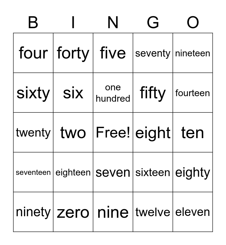 This bingo card has a free space and 30 words: zero, one, two, three, four, five, six, seven, eight, nine, ten, eleven, twelve, thirteen, fourteen, fifteen, sixteen, seventeen, eighteen, nineteen, twenty, thirty, forty, fifty, sixty, seventy, eighty, ninety, one hundred and one thousand.