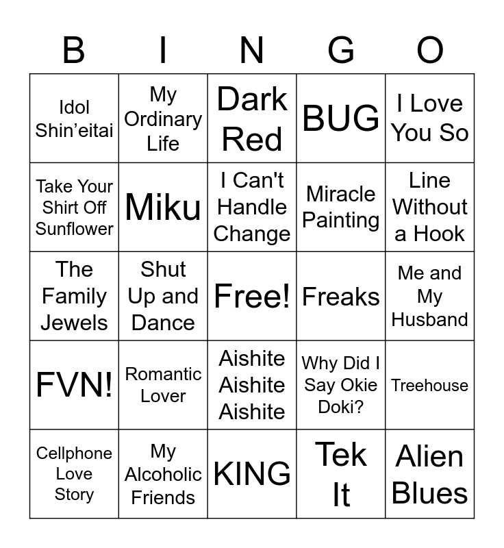 This bingo card has a free space and 57 words: Roki, Cellphone Love Story, Happy Synthesizer, Idol Shin’eitai, KING, Ghost Rule, Miku, IDSMILE, Miracle Painting, Becoming Potatoes, BUG, Somewhere Only We Know, Lost Library, Adore You, Burning Pile, Wild Side, I Love You So, Shut Up and Dance, La Seine, Alien Blues, Freaks, GUY.exe, Why Did I Say Okie Doki?, Dark Red, Roleplaying Game, I Can't Handle Change, Mr Loverman, Bang Bang Bang Bang, Line Without a Hook, Just Monika, Good Old-Fashioned Lover Boy, Hug Me Notion, My Time, Duet, Me and My Husband, Take Your Shirt Off Sunflower, Rude, The Family Jewels, SIU, FVN!, My Ordinary Life, Aishite Aishite Aishite, Chained To The Rhythm, I Want to Be Your Boyfriend, Fly Me To The Moon, Rhinestone Eyes, Romantic Lover, My Alcoholic Friends, Your Reality, Doki Doki Literature Club!, Feels, Tek It, Locked out of Heaven, Sports, Electrical, Treehouse and Fairytale.